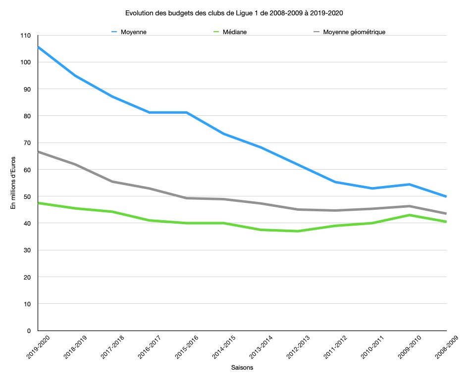 Si l’on s’intéresse à l’évolution moyenne des budgets de Ligue 1 entre la saison 2008-2009 et la saison 2019-2020 on s’aperçoit que le budget moyen est passé de 49,85 millions d’Euros à 105,6. Le budget moyen aurait donc doublé. Là se pose un problème mathématique, étant donné que la moyenne classique surreprésente les valeurs extrêmes (à la fois les très gros budgets comme ceux du Paris SG ainsi que les budgets beaucoup plus modestes), on peut privilégier la moyenne géométrique qui nuance ces valeurs extrêmes. Elle passe ainsi de 43,52 millions d’Euros à 66,57. Il y a donc toujours une progression mais est-elle homogène ? Pour s’apercevoir du problème qui se pose ici, on s’aperçoit que la médiane (valeur qui permet de couper l’ensemble des valeurs en deux parties égales), soit le budget qui compte autant de clubs qui en ont un supérieur ou inférieur. Le budget médian passe de 40,5 millions à 47,5, ce qui nous prouve bien que s’il y a une progression, elle est bien plus nette en première partie de classement qu’en deuxième.