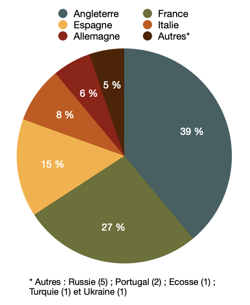 Reste une question importante, où partent ces joueurs contre des indemnités s’élevant à plus de 10 millions d’Euros. Comme nous pouvons le voir dans le graphique ci-dessous, le pays qui accueille le plus de joueurs est l’Angleterre dans 39% des cas. 27% de ces transferts sont des mouvements d’un joueur au sein du championnat de France. L’Espagne complète le podium avec 15%. On peut donc conclure que les transferts de plus de 10 millions d’Euros sont dans la plupart des cas destinés à l’étranger qui sont de très bons clients. La tendance récente est à l’achat compulsif de clubs anglais fortunés, de joueurs n’ayant que peu de saisons dans les jambes pour des sommes parfois très importantes. Un club français est aussi un très bon client, l’AS Monaco. Les monégasques, eux aussi très fortunés investissent en masse sur ce marché dans l’espoir de trouver de jeunes joueurs prometteurs, à les faire progresser et les revendre beaucoup plus chers à l’étranger. C’est ce que l’on appelle le trading.